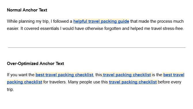 You should avoid keyword stuffing and promotional wording/anchors. Because the link should feel helpful and not forced. Good links always feel like a part of the explanation.